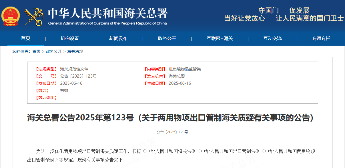 海關總署公告2025年第123號(關于兩用物項出口管制海關質疑有關事項的公告)