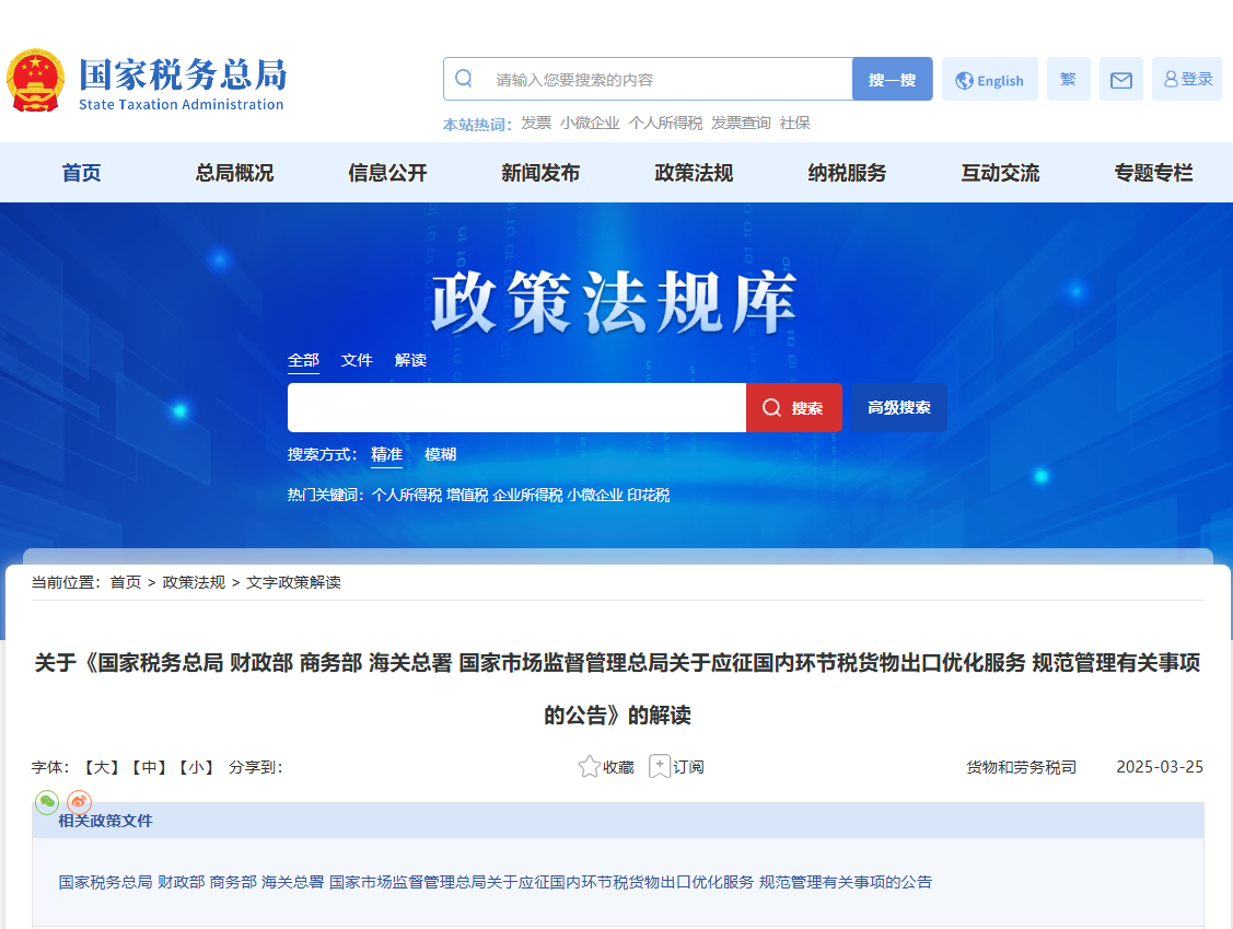 關于《國家稅務總局 財政部 商務部 海關總署 國家市場監(jiān)督管理總局關于應征國內環(huán)節(jié)稅貨物出口優(yōu)化服務 規(guī)范管理有關事項的公告》的解讀