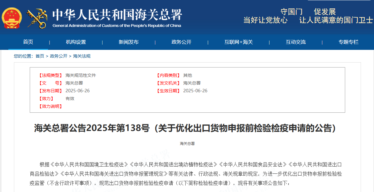 海關總署公告2025年第138號(關于優(yōu)化出口貨物申報前檢驗檢疫申請的公告)